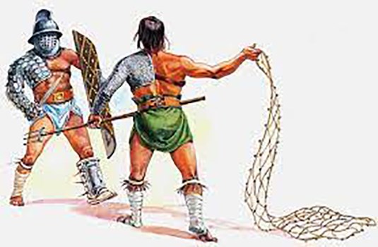 Arenadaki rakibi Retiarius ağla onu yakalamaya çalışır. Balık adam adıyla da anılır ve sözcüğün aslı Yunanca olup bir tuzlusu balığı anlamındadır. Bu kanlı arena oyunu İtalyan çocuk oyunlarında başka şekil alarak devam edip Kıbrıslı çocuklara saklambaç oyunu olarak geçtiği rivayet edilir.
