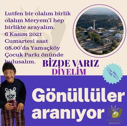 5 gün süren yoğun aramalara rağmen bulunamadı. Ailesi perişan. Meryem'den gelecek bir haberi bekliyor. Meryem'in bir gözü görmüyor, diğer gözü ise çok az görüyor. Yaşı 39 olmasına rağmen hala bir çocuk görüntüsünde. Meryem Toprak'ın görülmesi halinde 0533 877 3887 numaralı telefon numarasından iletişime geçilebilir.