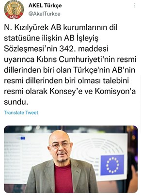 Niyazi Kızılyürek, Avrupa Birliği (AB) kurumlarının dil statüsüne ilişkin AB İşleyiş Sözleşmesi'nin 342. maddesi uyarınca Kıbrıs Cumhuriyeti'nin resmi dillerinden biri olan Türkçe'nin AB'nin resmi dillerinden biri olması talebini resmi olarak Konseye ve Komisyona sundu.