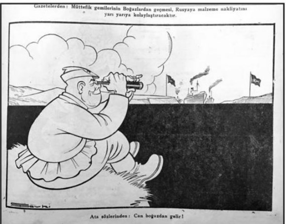 (Dönemin gazete haberlerinde Müttefik gemilerinin Boğazlardan geçerek Rusya'ya malzeme ve yiyecek nakliyatı yapmasını Bir Rus askerinin dürbünle İstanbul Boğazı'nı denetlemesi şeklinde veriliyor.)